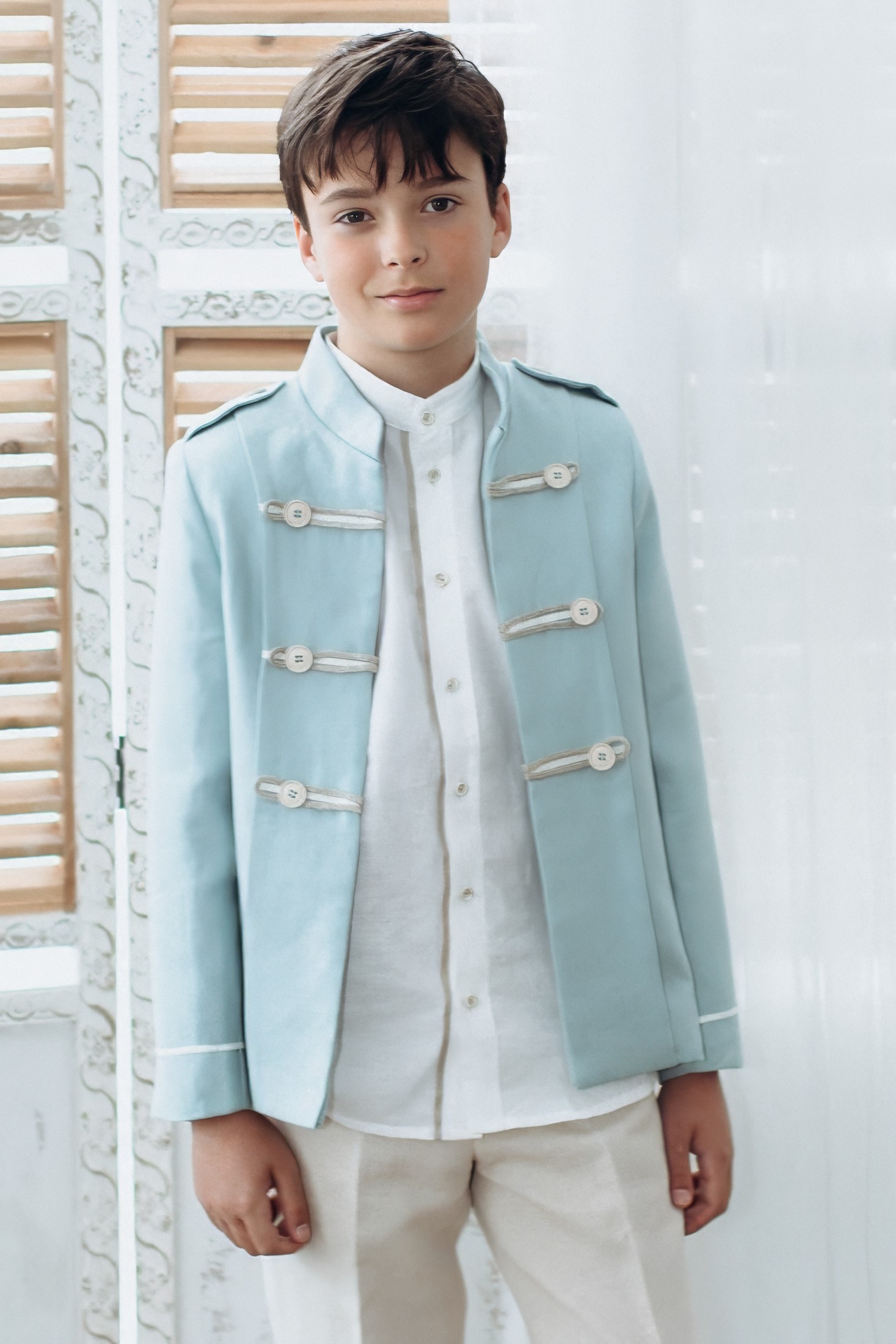 La chaqueta se combina con un pantalón recto tierra que puede ser largo o bermuda y una camisa a juego, un traje pensado no solo para destacar en estilo, sino también para que los niños se sientan cómodos y libres en su gran día.