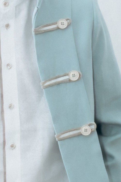 El conjunto está compuesto por una chaqueta de corte recto con botonadura con botones naturales , que aportan un aire fresco y juvenil.