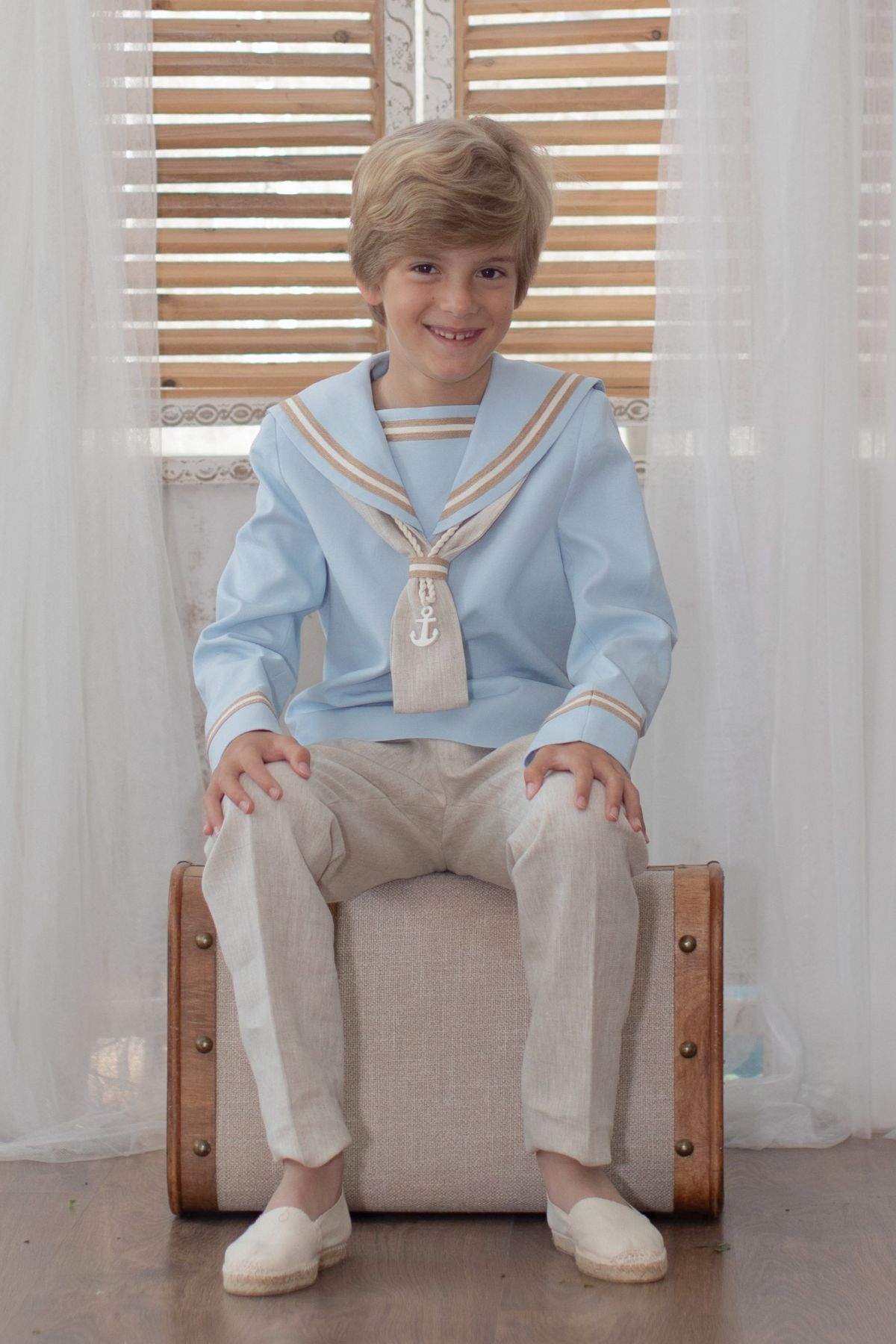 Traje de marinero de comunión en lino color azul cielo. Este elegante conjunto con un cuello marinero clásico adornado con finas líneas en yute e ivore que aportan un estilo tradicional.